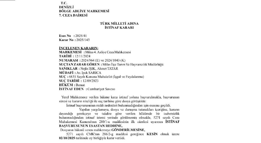 Akbelen Ormanında ormanlarını koruyan direnişçilerden Nejla Işık ve Ahmet Tatar, 6831 sayılı kanuna muhalefet ederek ormanı işgal ettikleri gerekçesiyle, Milas İlçe Tarım Müdürlüğü tarafından suçlanmışlardı. İki yıldır süren dava, 2 Ekim'de Denizli İstinaf Mahkemesinin verdiği kararla kesin olarak davalılar hakkındaki suçlamalar düşürüldü. Enerji ve Maden şirketlerinin Termik Santrale kömür çıkartmak için Akbelen Ormanındaki ağaçları kesmesine direnen Akbelen'in sevilen muhtarı Nejla Işık ve Kardok Derneği Başkanı Ahmet Tatar, korudukları ormanı işgal ettikleri suçlamasıyla yargılanmışlardı. İstinaftan çıkan kararla suçlamalar kesin olarak düştü.
