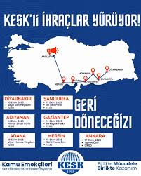 KESK’in “Adalet, Eşitlik ve İşimizi Geri Almak İçin Yürüyoruz” sloganıyla Diyarbakır’dan başlatılan yürüyüşü Şanlıurfa, Adıyaman, Gaziantep, Adana ve Mersin güzergahlarından geçerek Ankara’da son bulacak.