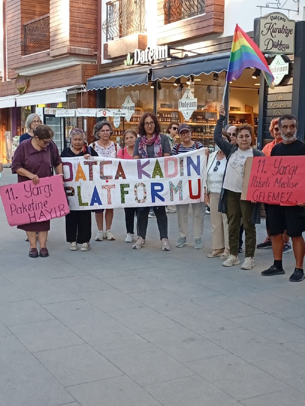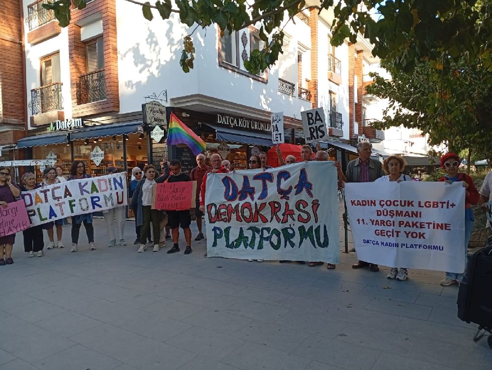 Türkiye’nin bir çok kentinde olduğu gibi Datça’da da 11.Yargı Paketine karşı çıkan vatandaşlar bugün bir kez daha (04.11.2025) sokağa çıktı. Her Salı Berkin Elvan Yontusu önünde düzenlenen “Adalet ve Barış” buluşmalarının 173.Haftasında, Datça Demokrasi Platformu’nun çağrısıyla bir araya gelindi. Eylemde Platform adına basın açıklamasını okuyan Ayla Atalay yaptığı açıklamada: “Bu paket, özellikle “genel ahlak” ve “doğuştan gelen biyolojik cinsiyet” kavramlarını temel alarak, bireylerin tutum ve davranışlarını cezalandırmayı öngörüyor. Taslağa göre, doğuştan gelen biyolojik cinsiyete veya genel ahlaka aykırı tutum ve davranışlarda bulunan, bunları alenen teşvik eden, öven veya özendiren kişiler, bir yıldan üç yıla kadar hapis cezasıyla karşı karşıya kalabilecek. Dahası, aynı cinsiyetteki kişilerin nişan veya evlenme töreni düzenlemeleri halinde, bu kişilere bir yıl altı aydan dört yıla kadar hapis cezası verilmesi planlanıyor” dendi.
